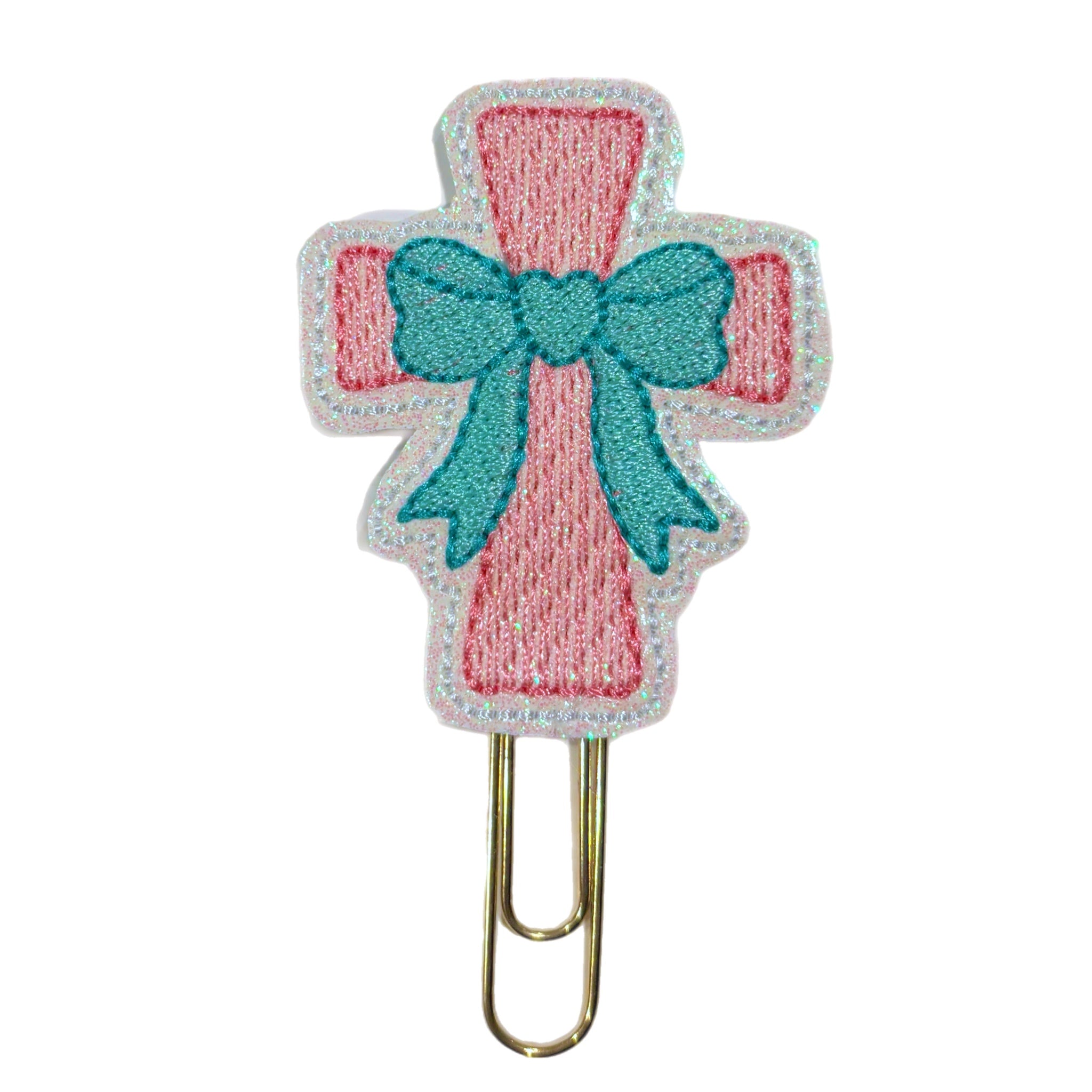 This elegant clip features a pink embroidered cross stitched onto white shiny vinyl for a subtle shimmer that catches the light just right. A sweet teal bow accents the cross, adding a gentle pop of color and charm. Each piece is carefully embroidered and backed with felt for durability and a soft finish.